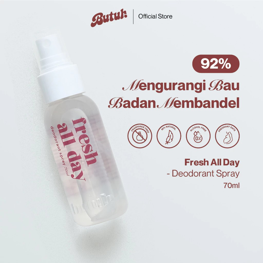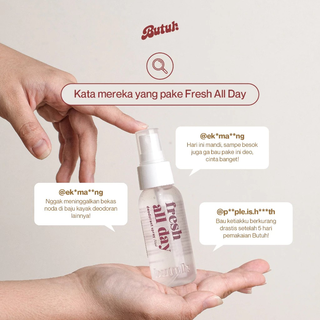 - Efektif Mengatasi Bau Badan: Meskipun bebas bahan kimia keras, "Butuh! Fresh All Day" tetap ampuh melawan bakteri penyebab bau badan, menjaga kesegaran sepanjang hari.