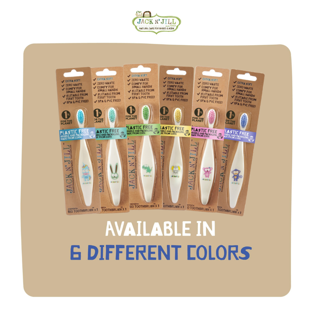 Jack N' Jill Bio Toothbrush mengusung konsep ramah lingkungan yang patut diacungi jempol. Pegangan sikat gigi ini terbuat dari 100% pati jagung non-GMO (genetically modified organism), sebuah material berbasis tumbuhan yang sepenuhnya dapat terurai secara hayati dan kompos. Bahkan, kemasannya pun didesain tanpa plastik, menggunakan karton daur ulang dan blister berbahan pati jagung yang juga dapat terurai. Ini berarti, setelah masa pakainya habis, pegangan sikat gigi ini dapat terurai dalam waktu sekitar 90 hari di fasilitas kompos komersial, jauh berbeda dengan sikat gigi plastik yang bertahan ratusan tahun.