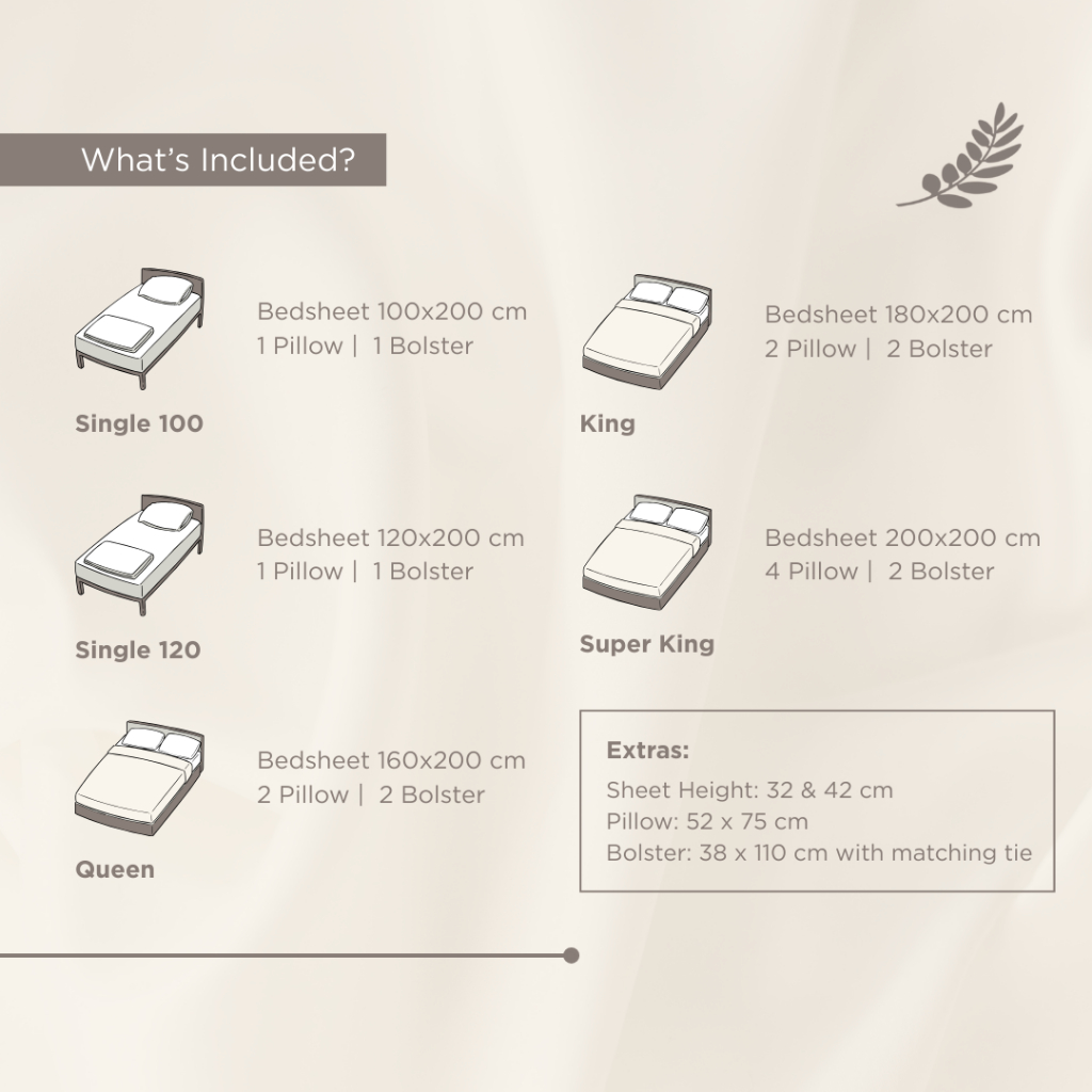Secara spesifikasi, sprei ini memiliki kerapatan benang 200 Thread Count (TC) dengan tipe Single Ply dan tenunan Percale Weave. Kerapatan 200 TC ini dianggap ideal untuk iklim tropis seperti di Indonesia, karena memungkinkan sirkulasi udara yang baik sehingga tetap terasa sejuk dan nyaman, baik dengan atau tanpa AC. Untuk ukuran 120x200, sprei ini hadir dengan tinggi karet 42 cm atau 35 cm, memastikan sprei terpasang rapi dan tidak mudah bergeser. Setiap pembelian sudah termasuk satu sarung bantal berukuran 52x75 cm dan satu sarung guling berukuran 38x110 cm, lengkap dengan tali guling yang senada dan sudah terpasang rapi.