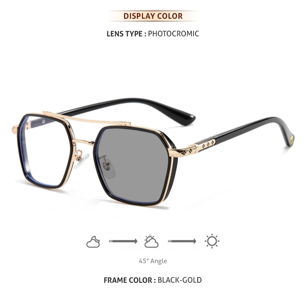 - Perlindungan Lensa Menyeluruh: Dilengkapi dengan lensa photocromic yang adaptif, anti radiasi (termasuk anti blueray), anti silau, dan UV400. Ini memastikan mata terlindungi secara optimal dari berbagai ancaman cahaya dan radiasi.