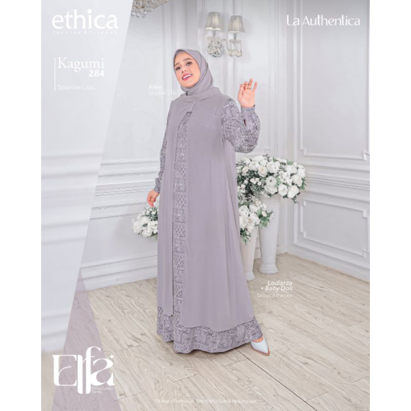 Untuk busana wanitanya, yaitu Gamis Ibu Kagumi 284 Sparrow Lilac, ethica memilih kombinasi bahan Lodiarza dan Baby Doll. Desainnya dibuat dalam dua potong (two pieces) dengan bukaan ritsleting yang menjadikannya busui friendly (ramah untuk ibu menyusui). Bagian outer gamis ini dilengkapi dengan bukaan kancing, sementara bagian tangan menggunakan ritsleting yang membuatnya wudhu friendly (mudah untuk berwudhu). Ada juga variasi layer hidup yang menambah dimensi dan keindahan pada siluet gamis. Sebagai pelengkap, tersedia Ailee Square Hijab berukuran 115x115cm dengan material EP.