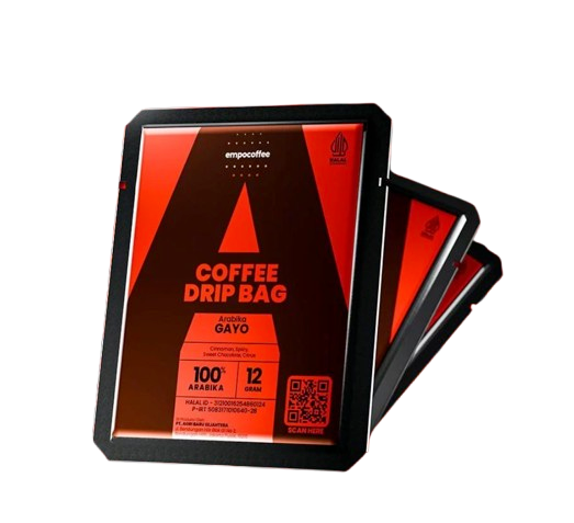 Empo Coffee Coffee Drip Bag Arabica Gayo dikemas dalam format drip bag yang inovatif. Konsep drip bag ini pada dasarnya adalah kopi bubuk yang sudah ditakar dalam kantong filter sekali pakai, menyerupai kantong teh celup. Desainnya sangat fungsional, dengan 'gantungan' yang bisa disangkutkan pada bibir cangkir, memungkinkan Anda menyeduh kopi berkualitas hanya dengan air panas dan cangkir, tanpa perlu alat seduh khusus. Ini menjadikannya solusi praktis dan higienis, serta memastikan kesegaran setiap sajian karena dikemas secara individual.