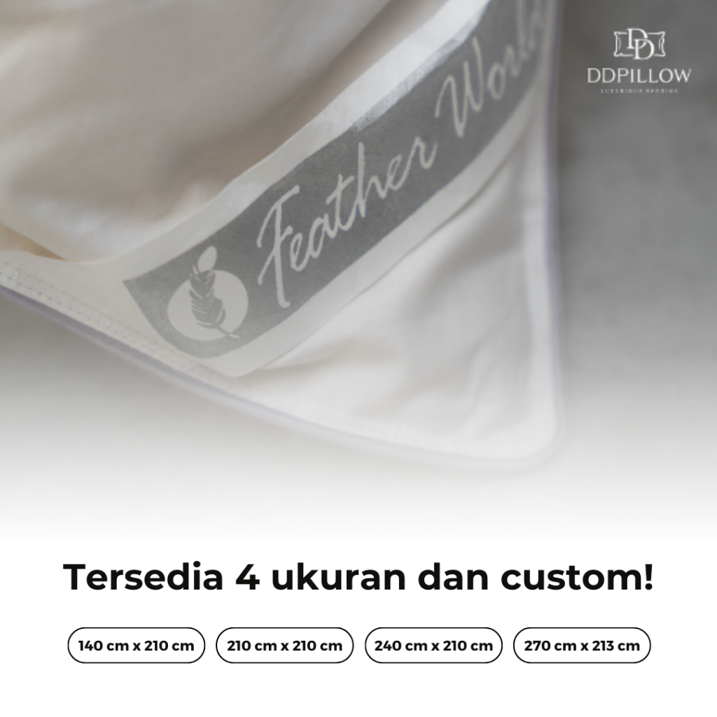 Feather World Selimut Bulu Angsa dirancang khusus untuk memberikan kehangatan optimal tanpa bobot berlebih, berkat isian bulu angsa premium di dalamnya. Salah satu indikator kualitas utama pada selimut bulu angsa adalah "fill power", yang mengukur kemampuan bulu angsa untuk mengembang dan memerangkap udara. Semakin tinggi nilai fill power, semakin ringan dan lembut selimut tersebut, namun tetap memberikan kehangatan maksimal. Bulu angsa dikenal memiliki kelompok bulu yang lebih besar dan kelembutan yang lebih baik dibandingkan bulu bebek, menghasilkan kehangatan dan keempukan yang superior.