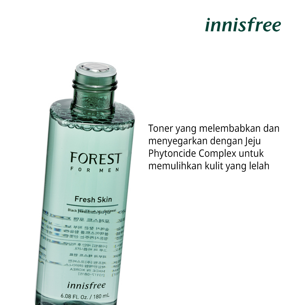 Innisfree Forest for Men Fresh Skin merupakan 'skin' atau toner bertekstur cair yang ringan, dirancang khusus untuk pria. Sejak versi pembaharuannya di tahun 2023, produk ini diperkaya dengan 'Black Yeast' dari Hutan Gotjawal Jeju. Black Yeast ini dikenal mampu membangun zat pelindung yang membantu menjaga kesehatan kulit. Namun, inti dari kekuatan produk ini terletak pada kandungan 'Jeju phytoncide complex', sebuah paduan ekstrak dari pohon pinus, cedar, dan cemara asli Jeju. Kompleks phytoncide ini bekerja aktif untuk meredakan kelelahan kulit dan menjaganya tetap sehat.