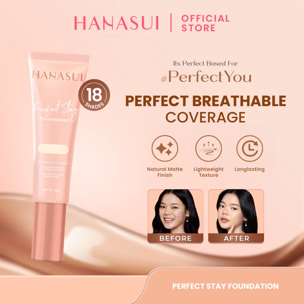 Untuk pilihan warna, Hanasui Perfect Stay Foundation tersedia dalam banyak shade, mulai dari 9 hingga 18 varian, yang dirancang untuk cocok dengan berbagai undertone kulit Indonesia, baik hangat, dingin, maupun netral. Dari segi kemasan, produk ini hadir dalam botol dengan pump yang praktis untuk mengeluarkan produk. Hanasui juga memastikan produk ini aman digunakan karena telah bersertifikat BPOM dan Halal.