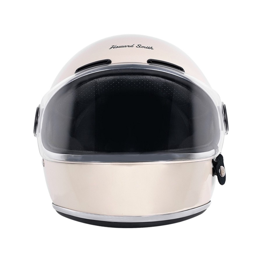 Howard Smith Tracker Retro Avorio Naiade adalah helm full-face yang dirancang khusus dengan gaya cafe racer, mengusung palet warna 'avorio naiade' yang elegan dan menawan. Desainnya yang bulat klasik dengan garis bersih dan 'chin bar' bergaya retro benar-benar memancarkan aura motor kustom tahun 60-an dan 70-an. Warna 'avorio naiade' sendiri memberikan kesan vintage yang kaya dan unik, menjadikannya bukan sekadar pelindung kepala, melainkan juga sebuah pernyataan gaya di jalan.
