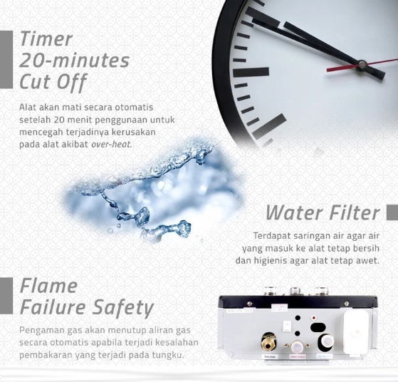 Beberapa fitur keamanan dan kepraktisan lainnya termasuk sistem Full Otomatis Water Heater yang menyediakan air hangat begitu kran dibuka, pengaman gas yang akan menutup aliran gas secara otomatis jika terjadi kesalahan pembakaran, serta fitur mati otomatis setelah 20 menit penggunaan untuk mencegah overheat. Tak lupa, adanya Water Filter atau saringan air membantu menjaga kebersihan air yang masuk, sehingga alat lebih awet. Proses instalasinya pun diklaim mudah dan cepat, bahkan tanpa perlu membobok tembok.