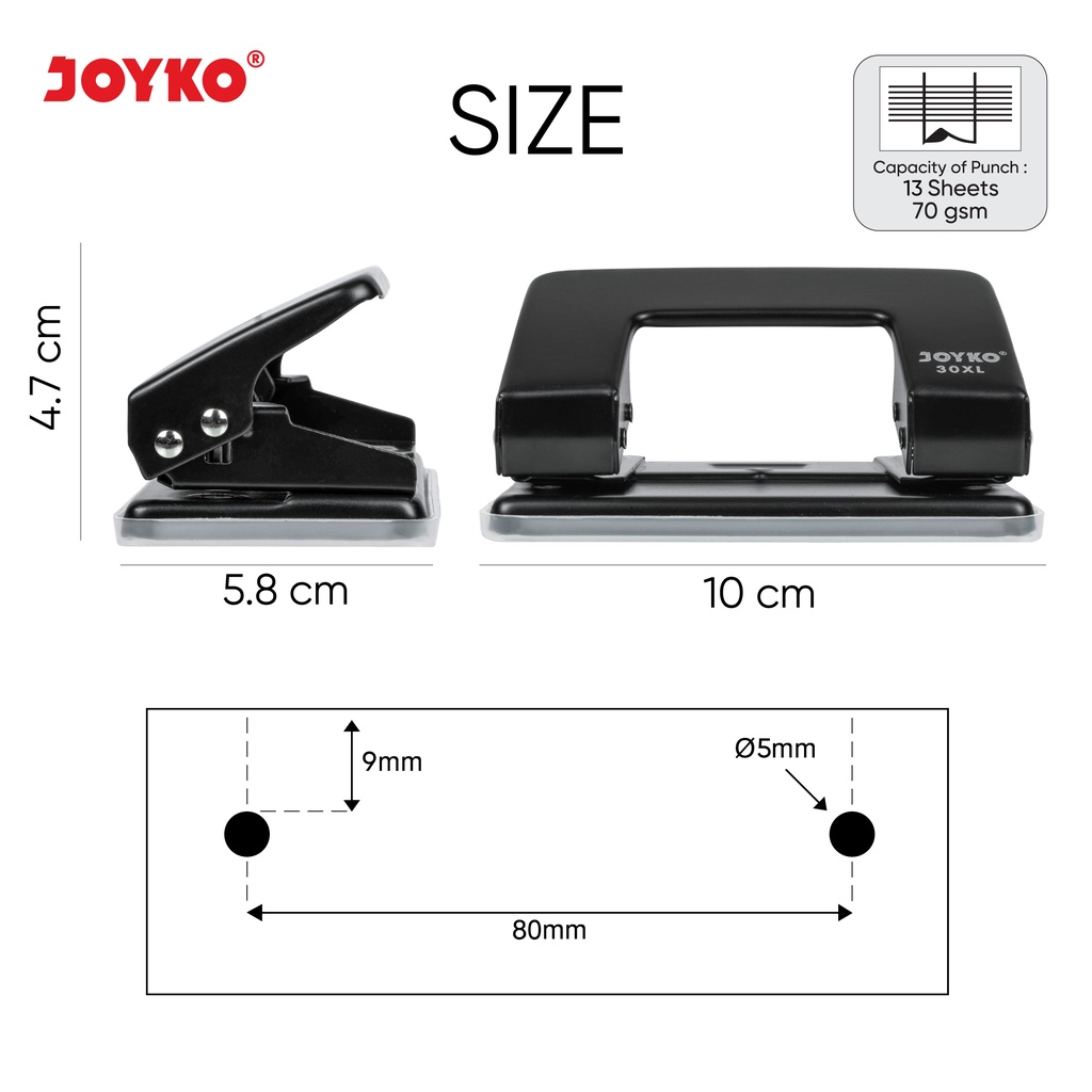 Kerapian hasil lubang adalah prioritas, dan JOYKO 30XL dibekali dengan "hardened cutters" yang memastikan perforasi bersih dan tidak merusak kertas. Diameter lubang yang dihasilkan presisi 5 mm, dengan jarak antar lubang standar 80 mm, sangat cocok untuk binder dan arsip dokumen pada umumnya. Selain itu, jarak tepi kertas ke lubang adalah 11 mm, menjaga posisi yang simetris dan profesional pada dokumen Anda. Tak ketinggalan, desainnya juga sudah mempertimbangkan kemudahan pengguna, termasuk sistem pembuangan sisa kertas yang praktis, sehingga Anda tidak perlu repot membersihkan serpihan kertas yang berserakan.