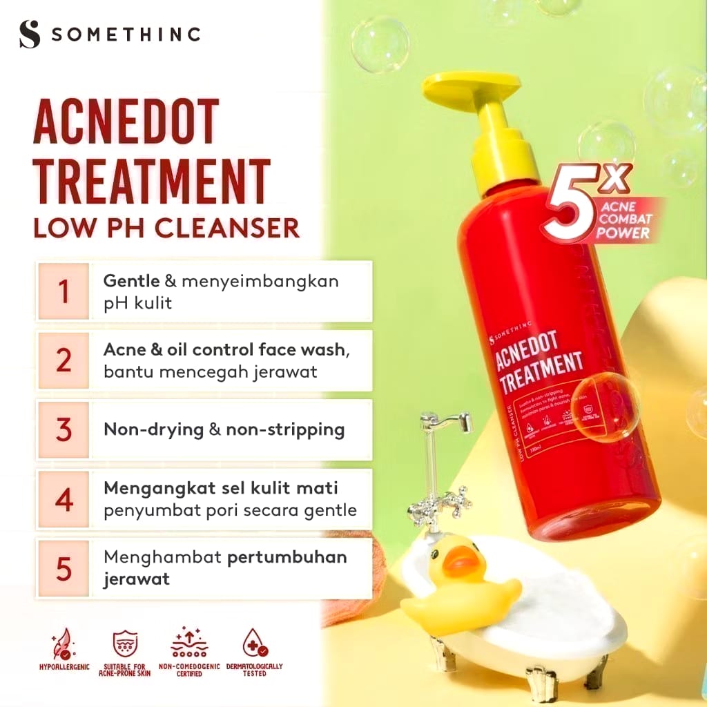 SOMETHINC ACNEDOT Treatment Low pH Cleanser diformulasikan sebagai pembersih wajah vegan dengan pH seimbang, yaitu pada rentang pH 5-6, yang merupakan pH normal kulit. Ini sangat penting untuk menjaga skin barrier tetap sehat dan tidak mudah iritasi. Produk ini dirancang dengan kemampuan 5X Acne Combat Power yang bekerja membersihkan pori-pori secara optimal sekaligus mengangkat kotoran, sel kulit mati, residu, dan minyak berlebih yang menjadi pemicu jerawat.