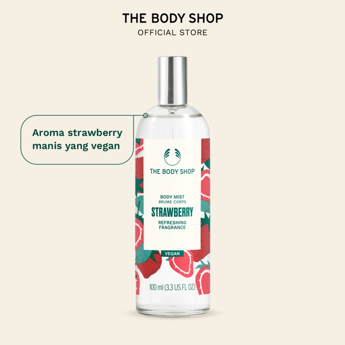 Sebagai penulis review produk profesional, kami selalu tertarik untuk mengulik detail teknis di balik setiap produk. The Body Shop® Strawberry Body Mist ini dikemas dalam botol kaca transparan berukuran 100ml yang kokoh, dilengkapi dengan semprotan ultra-halus dan tutup berwarna perak. Botol kaca ini tidak hanya memberikan kesan premium, tetapi juga memungkinkan Anda melihat sisa produk dengan mudah. Yang lebih penting, The Body Shop® terus berinovasi, dan kini kemasannya dibuat dari 31% kaca daur ulang, menunjukkan komitmen terhadap keberlanjutan lingkungan.