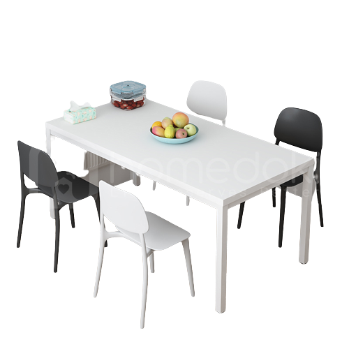 Dari segi material, Homedoki Ultra Dining Set menggunakan kombinasi yang cerdas. Bagian atas meja terbuat dari MDF (Medium Density Fibreboard) berkualitas tinggi yang memberikan permukaan halus dan mudah dibersihkan. Sementara itu, rangka penyangga meja menggunakan baja kokoh, menjamin stabilitas dan ketahanan beban yang tinggi. Rangka baja ini juga memiliki kinerja anti karat yang baik, memastikan Ultra Dining Set Anda tetap prima dalam jangka waktu lama. Desainnya mengusung gaya minimalis modern yang sederhana namun elegan, sangat cocok untuk berbagai tema interior rumah, mulai dari apartemen, kafe, hingga dapur modern. Pilihan warna putih yang cerah turut menambah kesan bersih dan lapang pada ruangan Anda.