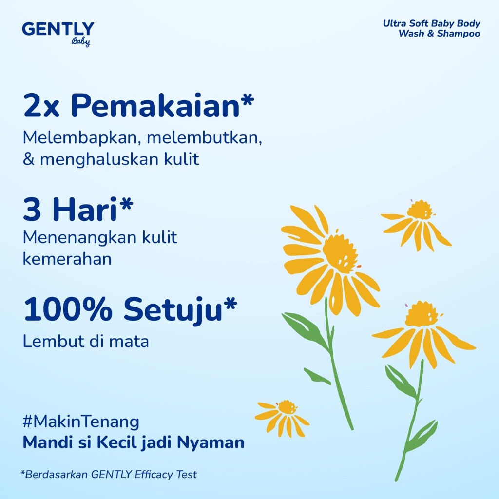 Lebih jauh lagi, GENTLY Baby Ultra Soft Baby Body Wash & Shampoo diformulasikan dengan sejumlah bahan alami yang bermanfaat. Di antaranya adalah Sunflower Seed Oil (minyak biji bunga matahari) dan Calendula Flower Extract (ekstrak bunga calendula) yang dikenal dapat menenangkan kulit dari rasa gatal dan kemerahan. Ada juga Aloe Vera Extract yang berfungsi menghidrasi, melembapkan, dan menghaluskan kulit, serta menjaga skin barrier bayi. Untuk perlindungan tambahan, produk ini juga mengandung Tocopheryl Acetate atau Vitamin E yang berperan sebagai antioksidan, melindungi kulit dari polusi dan radiasi sinar matahari. Semua manfaat ini membuatnya cocok dan aman digunakan untuk bayi baru lahir hingga balita, bahkan untuk jenis kulit normal, sensitif, kering, dan rentan gatal. Produk ini juga telah terdaftar di BPOM dengan nomor NA18220702217.