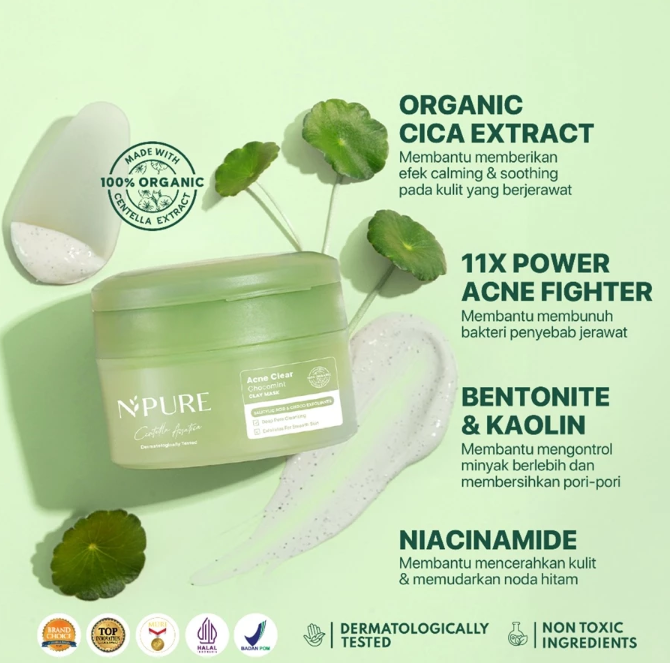 N'PURE Cica Chocomint Clay Mask merupakan produk dari brand lokal Indonesia, N'PURE, di bawah naungan PT. Penta Natural Kosmetindo, yang didirikan pada tahun 2017. Brand ini dikenal fokus pada produk perawatan kulit berbahan alami. Masker ini diformulasikan dengan dasar bentonit dan kaolin, dua jenis clay yang dikenal luas kemampuannya dalam membersihkan pori-pori secara mendalam dan menyerap minyak berlebih pada kulit. Bentonit, misalnya, dikenal memiliki sifat antibakteri dan anti-inflamasi, serta mampu menarik kotoran penyebab jerawat dari pori-pori. Sementara itu, kaolin lebih lembut dan ideal untuk kulit kering serta sensitif, menjadikannya pilihan yang baik untuk menyerap sebum tanpa membuat kulit terlalu kering.