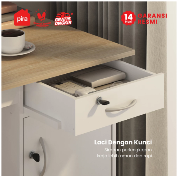 Salah satu nilai jual utama meja ini adalah fitur penyimpanannya. Pira Metropolis MT 122 N dilengkapi dengan laci dan rak penyimpanan tertutup. Laci dan rak ini juga dilengkapi dengan kunci, sebuah fitur cerdas yang menjaga barang-barang pribadi atau dokumen penting Anda tetap aman. Handle laci dan rak didesain minimalis, menambah kesan rapi dan fungsional pada keseluruhan meja.