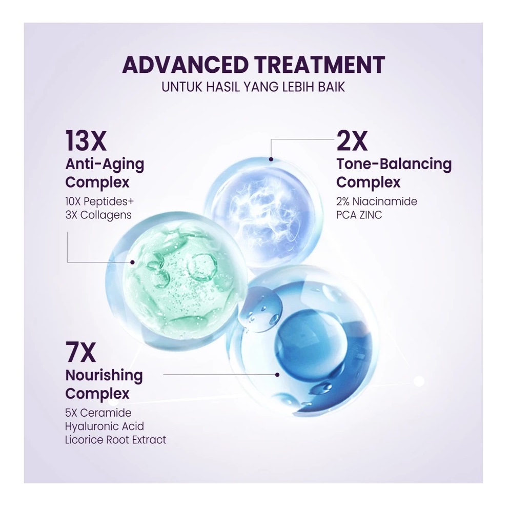 Tidak hanya itu, serum ini juga diperkaya dengan 2% Niacinamide, yang berperan penting dalam mencerahkan kulit, mengurangi noda hitam, dan meratakan warna kulit. Niacinamide juga membantu mengontrol minyak berlebih dan menjaga kekenyalan kulit. Ditambah lagi, kehadiran 10X Peptides dalam formulanya mendukung pembaruan kulit dan membantu mengembalikan elastisitasnya, menjadikan kulit terasa lebih kencang dan tampak lebih muda. Beberapa sumber juga menyebutkan adanya 3X Collagen dan 7X Repair Moisture Complex yang turut menjaga kelembapan serta memperkuat skin barrier.
